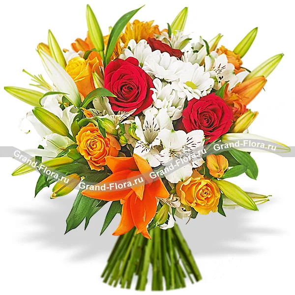 Стандартный (на фото): лилия желтая - 3 шт.,  роза желтая - 4 шт., роза красная - 3 шт., альстромерия белая  - 3 шт., хризантема кустовая ромашковая (белая) - 1 шт., сетка желтая.
