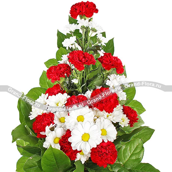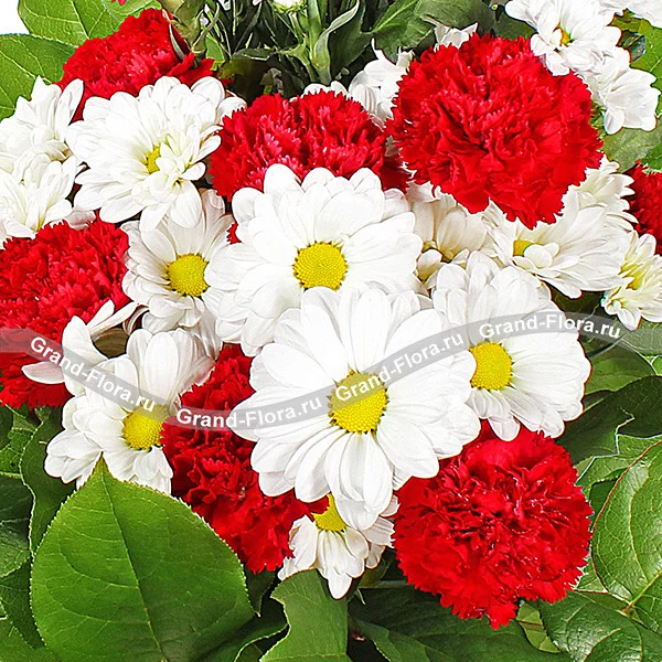 Стандартный (на фото): гвоздика красная - 11шт., хризантема белая ромашковидная - 5 шт., салал, сетка.
