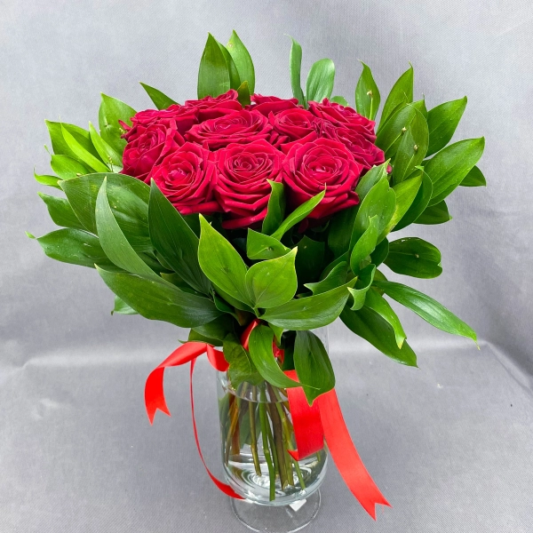 11  роз: роза красная (70см) - 11 шт., рускус (или салал) - 6 шт., упаковка, лента.