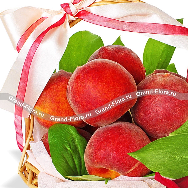 Стандартный: роза красная - 1 шт., рускус - 2 шт., персики - 1,5 кг, фетр розовый, корзина средняя, бант.