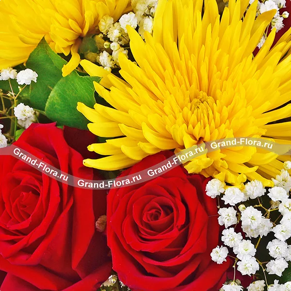 Уменьшенный: роза красная (50 см) - 5 шт., хризантема одноголовая (желтая) - 2 шт., гипсофила - 1 шт., крафт, лента.