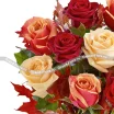 15 роз: роза красная - 6 шт.(70см), роза оранжевая - 5 шт.(70см), роза кремовая - 4 шт.(70см), Декор - осенние листья/ или упаковка.