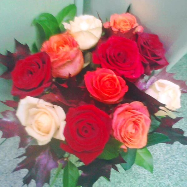 Выигрышное сочетание роз трех оттенков – нежного кремового, страстного красного и пленительного оранжевого – поможет выразить чувство благодарности и уважения. Дополненный осенними листьями букет не оставит равнодушной его получательницу