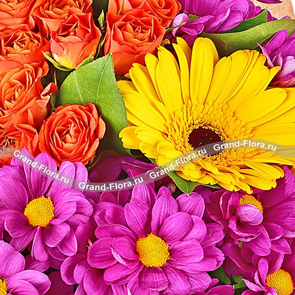 Стандартный (на фото): хризантема кустовая ромашковая (фиолетовая) - 3 шт, гербера желтая - 3 шт, роза кустовая оранжевая - 1 шт (в центре), рускус или салал, фетр оранжевый + шоколад DOVE в подарок(возможна замена на шоколад "Коркуноф" " Ritter sport" или "Milka").