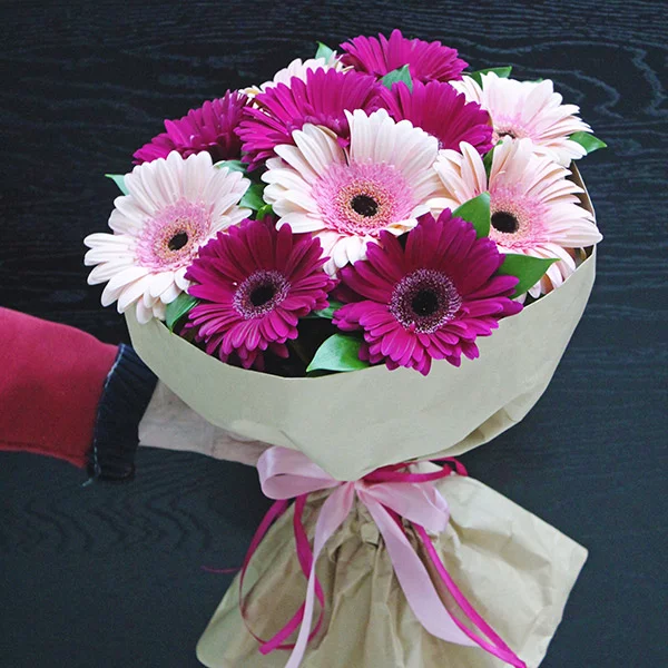 Стандартный: гербера малиновая - 6 шт., гербера розовая - 5 шт.,  декоративная зелень, упаковка крафт, лента.