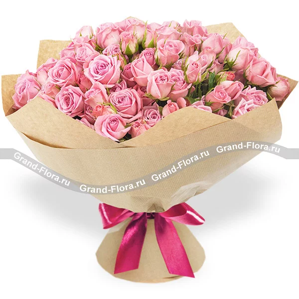 Стандартный: роза кустовая розовая - 9 шт, упаковка, лента розовая. Примерный размер: 25Х25 см.