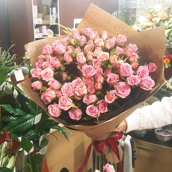 роза кустовая розовая - 25 шт, упаковка, лента розовая. Примерный размер: 45Х45 см.