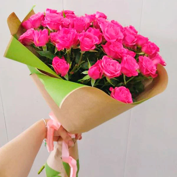 (на фото) роза кустовая розовая - 15 шт, упаковка, лента розовая. Примерный размер: 35Х35 см.