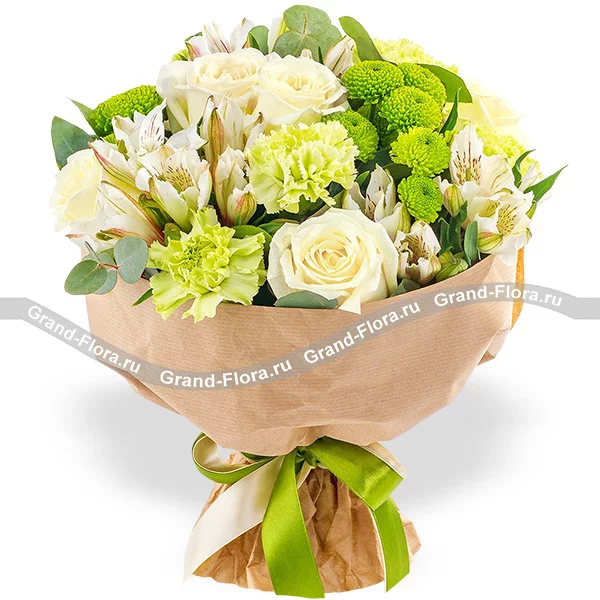Люкс: роза белая - 13 шт., гвоздика зеленая - 8 шт., альстромерия белая - 8 шт., эвкалипт, декоративная зелень, кустовая хризантема зеленая- 8 шт., упаковка крафт, лента. Примерный размер: 35Х35 см.