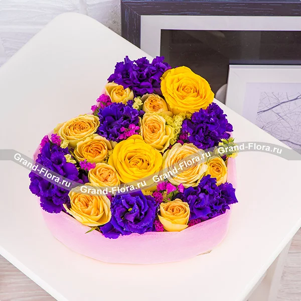Мой Купидон - сердце с кустовыми розами и эустомой