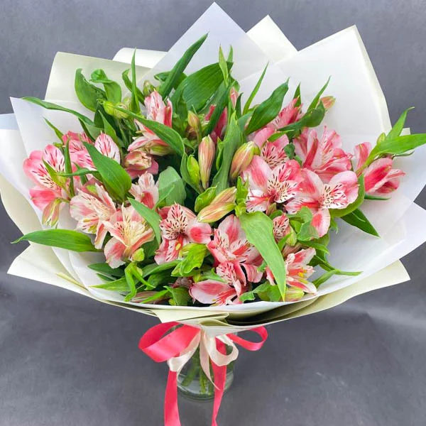 Букет состоит из альстромерии, которую еще называют перуанской лилией из-за внешнего сходства, разнообразное цветовое сочетание, в окружении декоративной зелени. Диаметр букета от 25см до 50см, в зависимости от выбранного варианты букета.  Букет перевязан изящным розовым бантом. Обращаем Ваше внимание, что состав и оформление букета может отличаться.